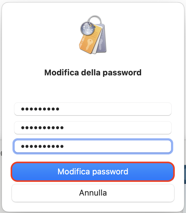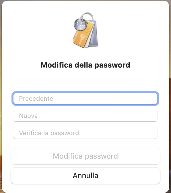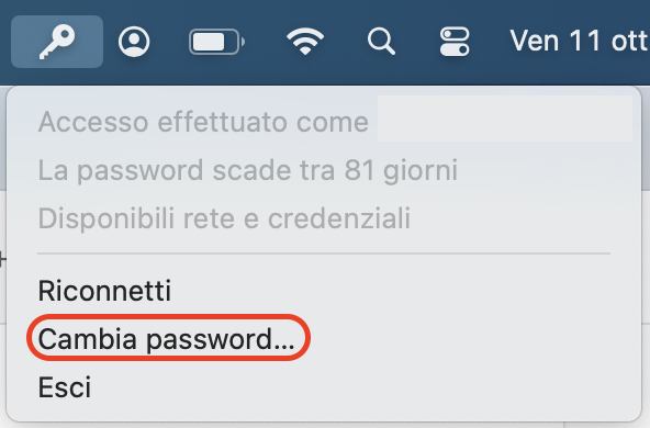 To modify password using keychain please make sure to be connected to the IIT network (i.e. within the IIT offices or abroad via VPN) and press the Key icon > Change password (Cambia password)